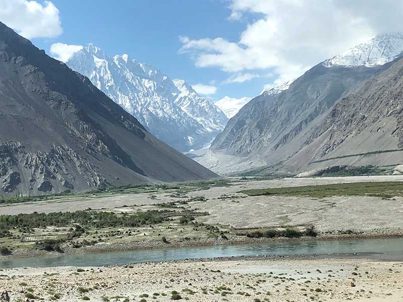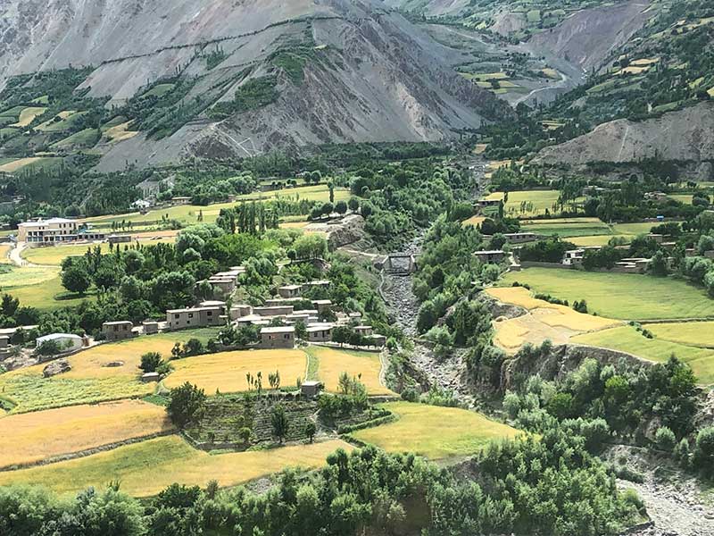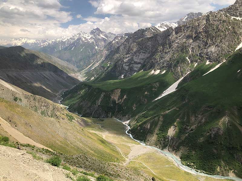 On continue notre route pour Khorog (2000 m), capitale de la région autonome du Haut-Badakhchan. Située de part et d’autre de la rivière Gunt, elle offre une vue imprenable sur les nombreux pics majestueux qui l’entourent. La route longe toujours la frontière afghane ; peu à peu, on quitte les vertes plaines pour une superbe région montagneuse d’où se dégage une saisissante sensation de calme et de sérénité́.