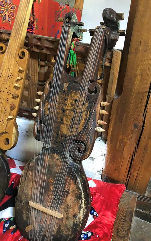 Notre guide excelle non seulement dans l’art de la narration, mais également en musique, il nous interprète, avec d’anciens instruments à corde du musée, quelques partitions traditionnelles pamiri. Une étrange sonorité́ très mélodieuse, nous emporte dans un autre univers.. Un moment fort...