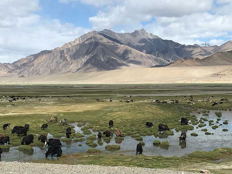 Nous nous dirigeons vers le lac Karakul (de 3923m). En passant le col Akbaital à 4655m, c’est le col le plus haut de notre parcours. Nous nous arrêtons pour le déjeuner dans une famille kirghiz près du lac. Même si nous avons traversé́ les frontières du Tadjikistan, l’ethnie qui habite ces régions-là̀ sont des nomades d’origine kirghiz. Ils élèvent des yaks principalement à cette altitude.