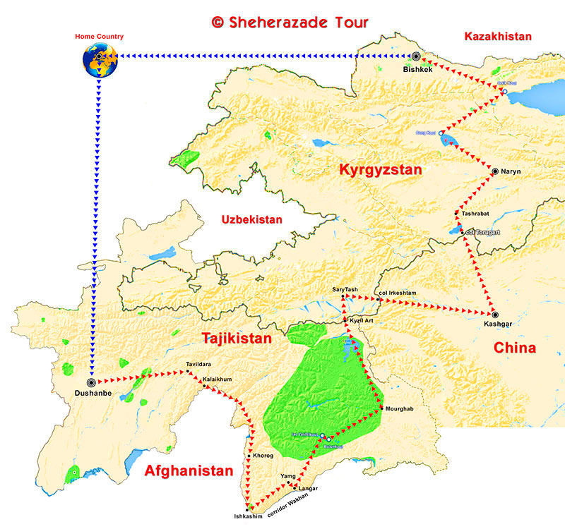 Carte de Pamir à Kashgar Le Tadjikistan possède plusieurs des plus hautes montagnes du monde, dont les chaînes Pamir. Les chaînes montagneuses sont séparées par des centaines de canyons, vallées et gorges, au fond desquels coulent des torrents rapides. Le Pamir est la chaine de montagne qui détermine la frontière entre Tadjikistan et Afghanistan. Au milieu de ces deux géants se dessine la vallée du Wakhan où des communautés nomades vivent sous leurs yourtes en élevant des troupeaux de yack. Une nature sauvage où se glisse en silence le léopard de neige et les mouflons. Un pays pauvre où la richesse réside surtout dans la sensibilité de ses habitants.