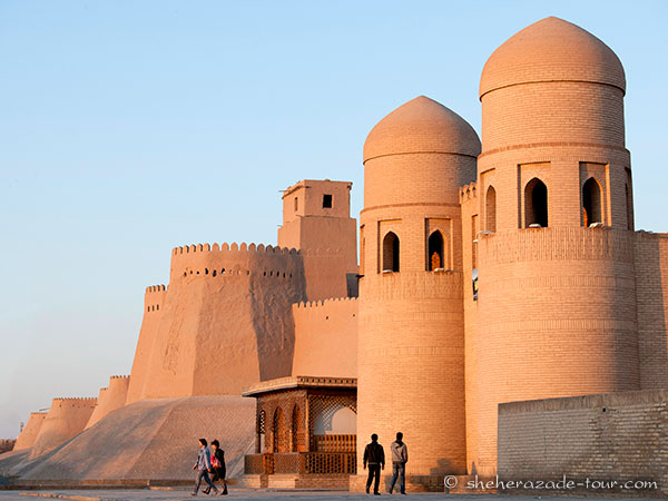 Découverte d’Itchan Kala, la vieille ville ceinte de remparts. Véritable ville-musée, elle regorge de monuments parfaitement restaurés qui plongent ses visiteurs au cœur des contes des « Mille et Une Nuits ». Début des visites avec la medersa Mouhammad Amin Khan et le minaret Khodja, la forteresse Koukhna Ark – qui regroupe la Salle du Trône et la Chancellerie –, la mosquée Juma, la medersa Mohammed Rakhim du khan poète, connu sous le pseudonyme de Ferouz.