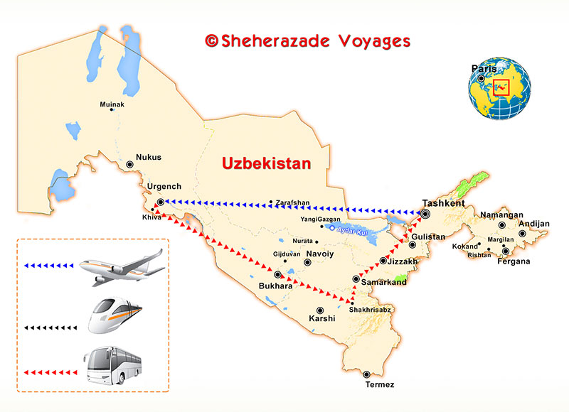 Dans la soirée, départ de Paris à destination de Tachkent. Nuit à bord.